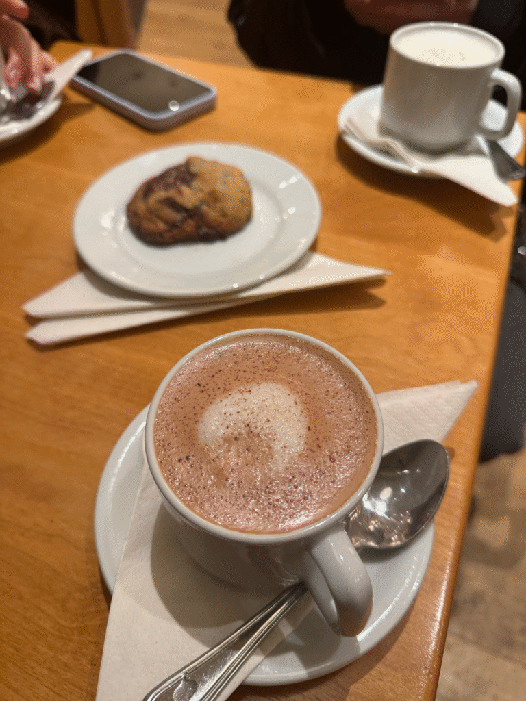The cafe is cute and cozy, making it feel like a small escape from the busy, cold streets outside. The hot chocolate is rich and satisfying, and the pastries are perfect for sharing. It is an ideal spot for a slow afternoon, studying, or a chill catch-up with friends.